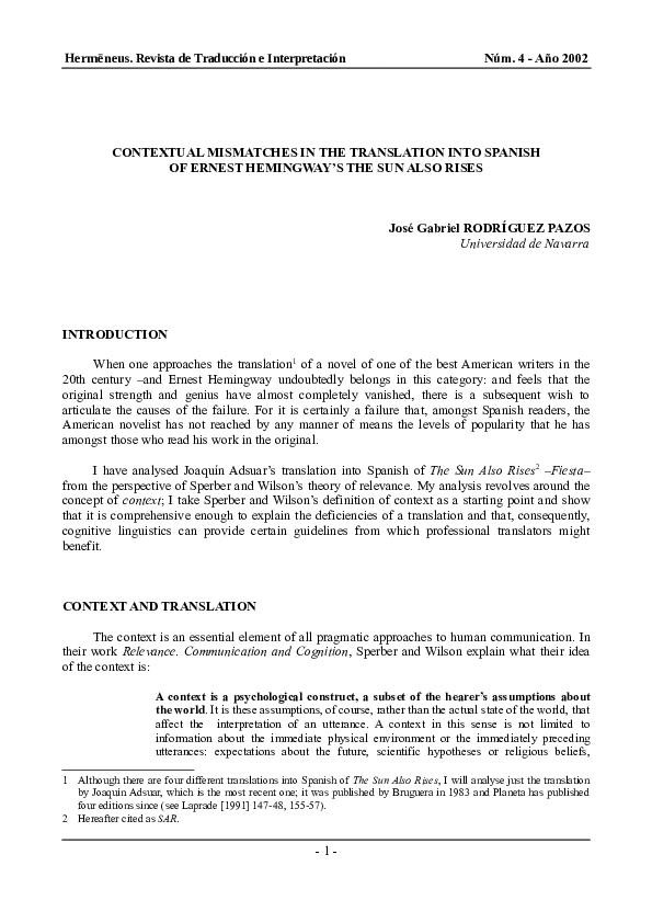 Pdf Contextual Mismatches In The Translation Into Spanish Of Ernest Hemingway S The Sun Also Rises Hermeneus Revista De Traduccion E Interpretacion Academia Edu